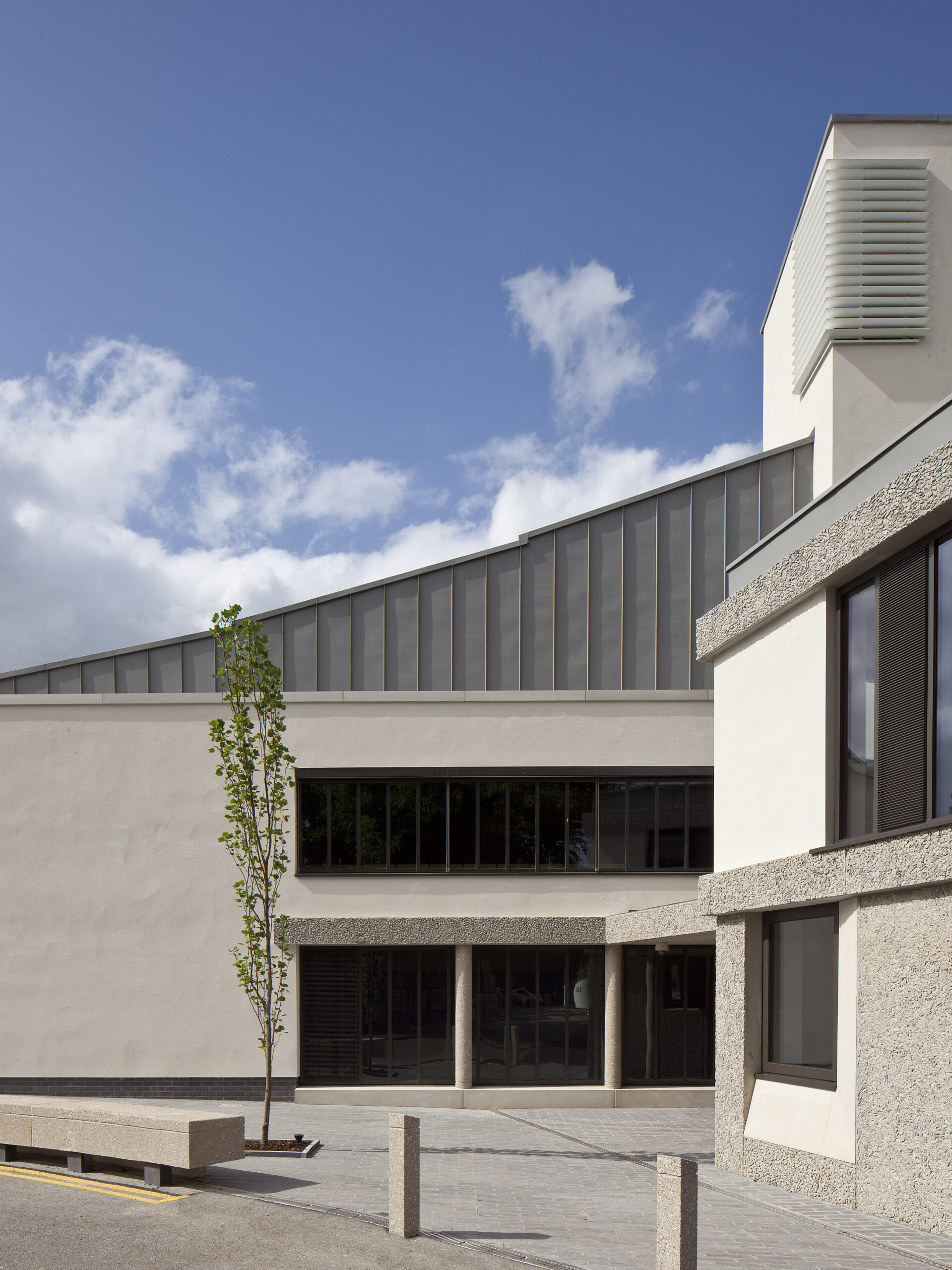 Powell & Moya’s design strategies informed the more recent additions: the residential M block and Catherine Marriott building, the new entrance, Leonard Wolfson Auditorium, and the Academic Wing. The new entrance is not a formal gateway, but is quite low on the side of the tower which naturally ventilates the auditorium: this tower is not central but asymmetrically placed on a corner of the auditorium, and the internally twisting roof form is another homage to asymmetry. The auditorium, unusually, is not a dark space, but has windows so that it is bright in the day with the all-important trees and sky always visible.