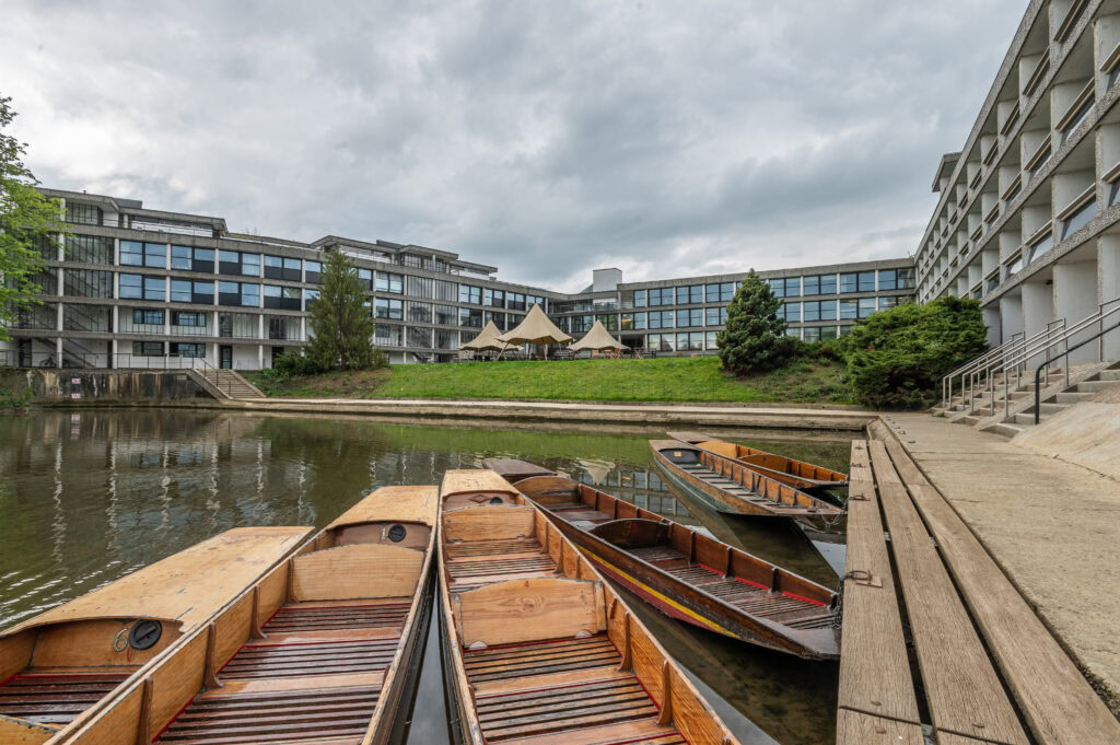 The harbour, with its punts, has been at the heart of Wolfson College since it opened on the Cherwell in 1974. Part of the architectural genius of the College is that, though the initial impression on arriving along Linton Road is of a low building with only two storeys, by the time you get down to the water’s edge at the harbour it has become five storeys high. The ground slopes sharply down, but the lines of the building, the flatness of the lawns, and the groundwork which preceded the construction all give a sense of horizontality which supports the atmosphere of calm in a college full of researchers.