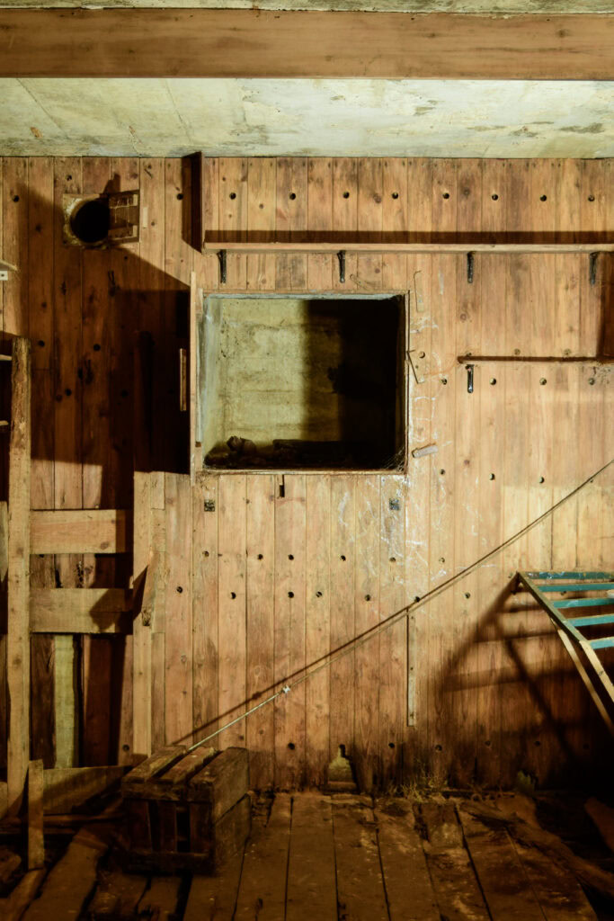 These steps lead to a small lobby with store-room and toilet, and then to the main room with an exit-shaft at the far end. Overall, this bunker (to dignify it by the term) resembles the design of an air-raid shelter published in 1938 by the newly-created Air Raid Precautions Department, which has suggested that it was built in the very late ’30s, when the threat – and fear – of war with Hitler’s Germany was much increased. But the sophisticated internal fittings suggest it was not just a shelter. Its main, concrete-built room not only had a wooden floor, it was neatly panelled in wood, with shelves and built-in desks. It even had electrical lighting.
