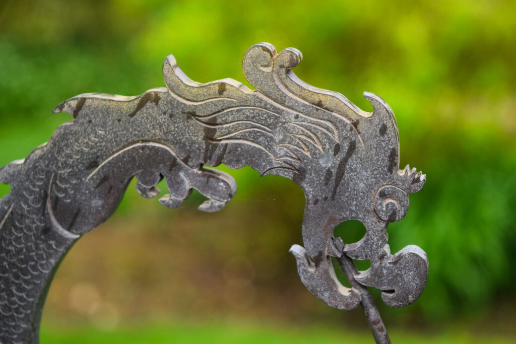 Towards the end of the car park Walter also planned and planted a formal garden, beginning in 1986. 1986 was a hard winter, and the gardeners have memories of constructing the pergola on frozen ground with a wind chill factor of -12⁰. Sir Henry Fisher, then coming to the end of his time as President, offered to give a sundial to the College on his retirement, and this became the perfect centrepiece of the new garden. It was designed for us by Oliver Gero of Brookbrae Sundials and is very accurate; it is set to Oxford time, 5 minutes later than Greenwich Mean Time. The gnomon of the dial is an oriental dragon, which reflects the planting theme. The plants used are all Chinese, Japanese or Himalayan in origin.