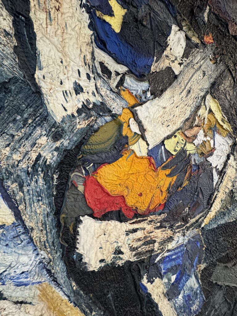 An abstract oil painting by Ian Meijer entitled ‘Fleurs pour un tombeau marin’, a generous donation from Wolfson MCR Ronnie Sonneborn (2002-), is now on display in the Upper Common Room.
