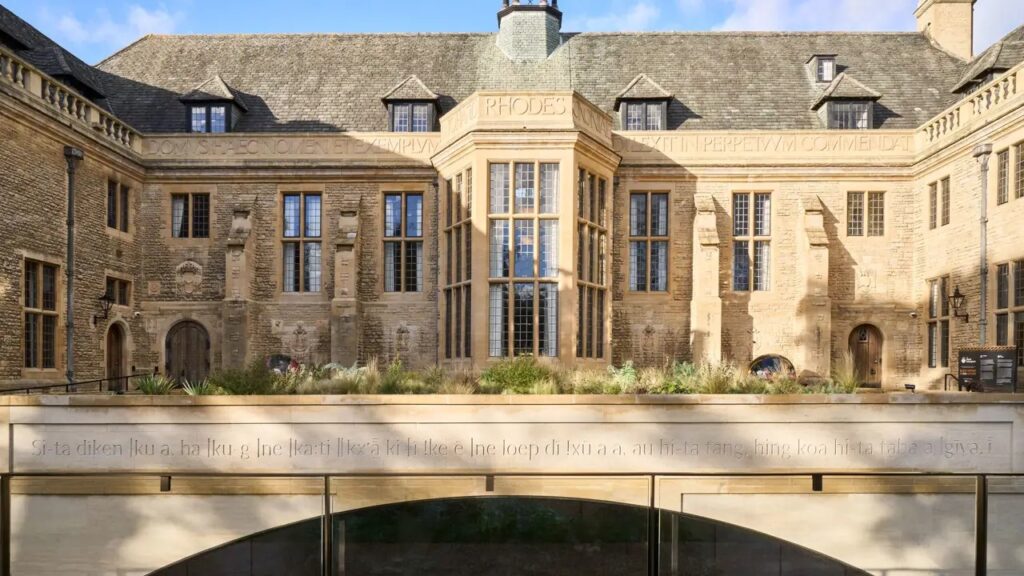 During the design work for the redevelopment of Rhodes House in 2021-23, an opportunity was identified to create a stone parapet on the south facade which could accept a text inscription. Wolfson GBF and Rhodes Scholar Professor Elleke Boehmer and Wolfson alum Luan Staphorst (GS 2021-22) were tasked with finding a way to translate the inscription into ǀxam, the southern African language which is now a ‘sleeping language’, meaning that it is no longer used by any group as a mother tongue.